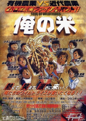 - その第一弾は2001年、初期の「激富」の拠点の劇場だった扇町ミュージアムスクエアで、有機農業と近代農業の戦いを描く『SOUL OF WILDTHINGS 俺の米』。農協の大ちゃんを演じたはだをいじめるフランキーのシーンでは上演中にお年寄りからの非難の声があがる程のリアリティ。続けて翌年には日本の若い株式投資家達の戦いを描く『SOUBA〜SPIRITS OF JAPANESE〜』を製作。刀を台詞に変えた立ち回りが観客を魅了。その老若男女を問わない作風が話題を呼び幅広い世代から支持を得ます。現在の主力メンバーとなる内村哲哉や小野木秀樹がここで加わります。