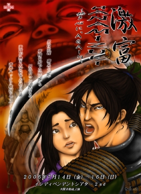 「激富(げきとん)」は、当時「劇団☆新感線」に所属していたフランキー仲村が結成し活動していたコント集団「激男富田林」を前身として1992年に旗揚げました。劇団☆新感線の稽古場が隣接されていた大阪扇町のミュージアムスクエア「フォーラム」という小劇場で、記念すべき演劇製作第一弾となる『熱き心に~熱海殺人事件より~』を上演。終演曲として小林旭の『熱き心に』を流した事が当時の関西小劇場界では話題となりました。その年の秋には周防正行監督の92年の映画『しこふんじゃった』を戯曲化、これを『熱き心に2〜しこふんじゃったより〜』として上演、翌1993年、満を持してフランキーのオール書き下ろしによる『熱き心に3~花みずき~』を製作。戦国時代に生きる若き日の上杉謙信の青春と悲恋がフランキー流に熱くテンポよく描かれ、この作品で客席が笑いと涙に包まれました。そしてその後フランキーは、自分の芝居感を追求する為に舞台芝居から映像芝居に活動の場を移します…