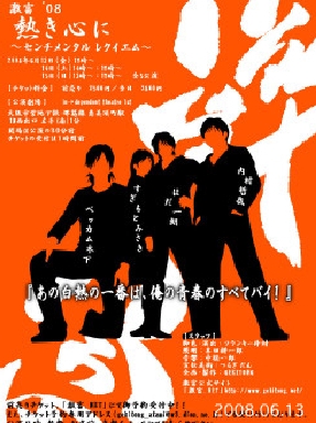 劇場の規模を上げた事で現在の「激富」の演出や構成に限界を感じたフランキーは、「チャレンジ企画」と称して劇団と団員の自らのスキルアップと新たな可能性を模索する実験公演を行います。- 「チャレンジ企画 第一弾」は、初心に戻るべくお客様は目の前、キャパ100以下の小劇場公演。激富の旗揚げ演目であり2度目の再演となる「熱き心に08’~センチメンタルレクイエム~」を選抜メンバーで上演。フランキー流のつか芝居に観客だけでなくキャスト・スタッフまでもが度肝を抜かれます。