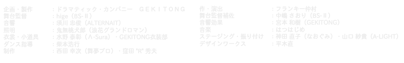 企画・製作:GEKITONG 作・演出:フランキー仲村 舞台監督:中嶋 さおり(BS-Ⅱ) 舞台監督補佐:hige(BS-Ⅱ)